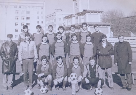 На знімку чемпіонський склад «Фрунзенця» 1987 року, який готували Володимир ПОПОВ (крайній ліворуч), Юрій ПАНЧЕНКО і Микола АСТАФЬЄВ (ліворуч).